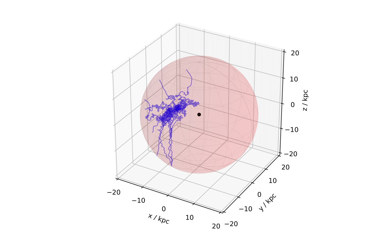 The image shows trajectory of a few cosmic rays of energy 1 EeV in the Galactic magnetic field (Das et al. 2020 ApJ). The black and blue dots are the Galactic center and Earth respectively.